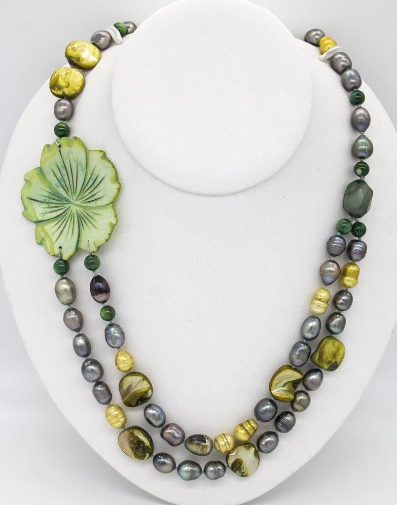 Ssilver Gradient Green FW Circle Pearl MOP Lotus Flower Necklace