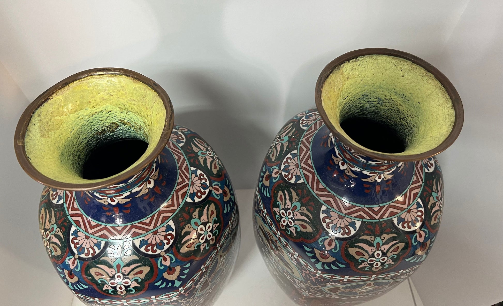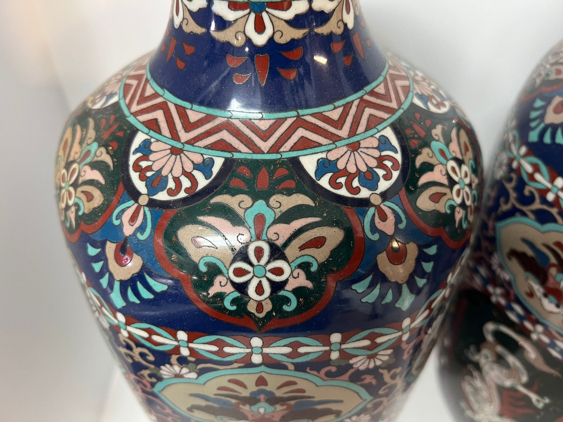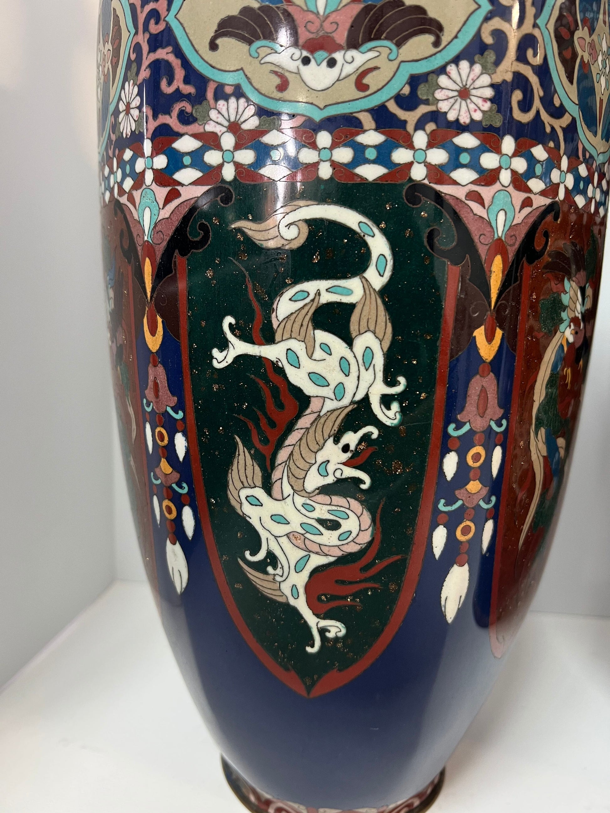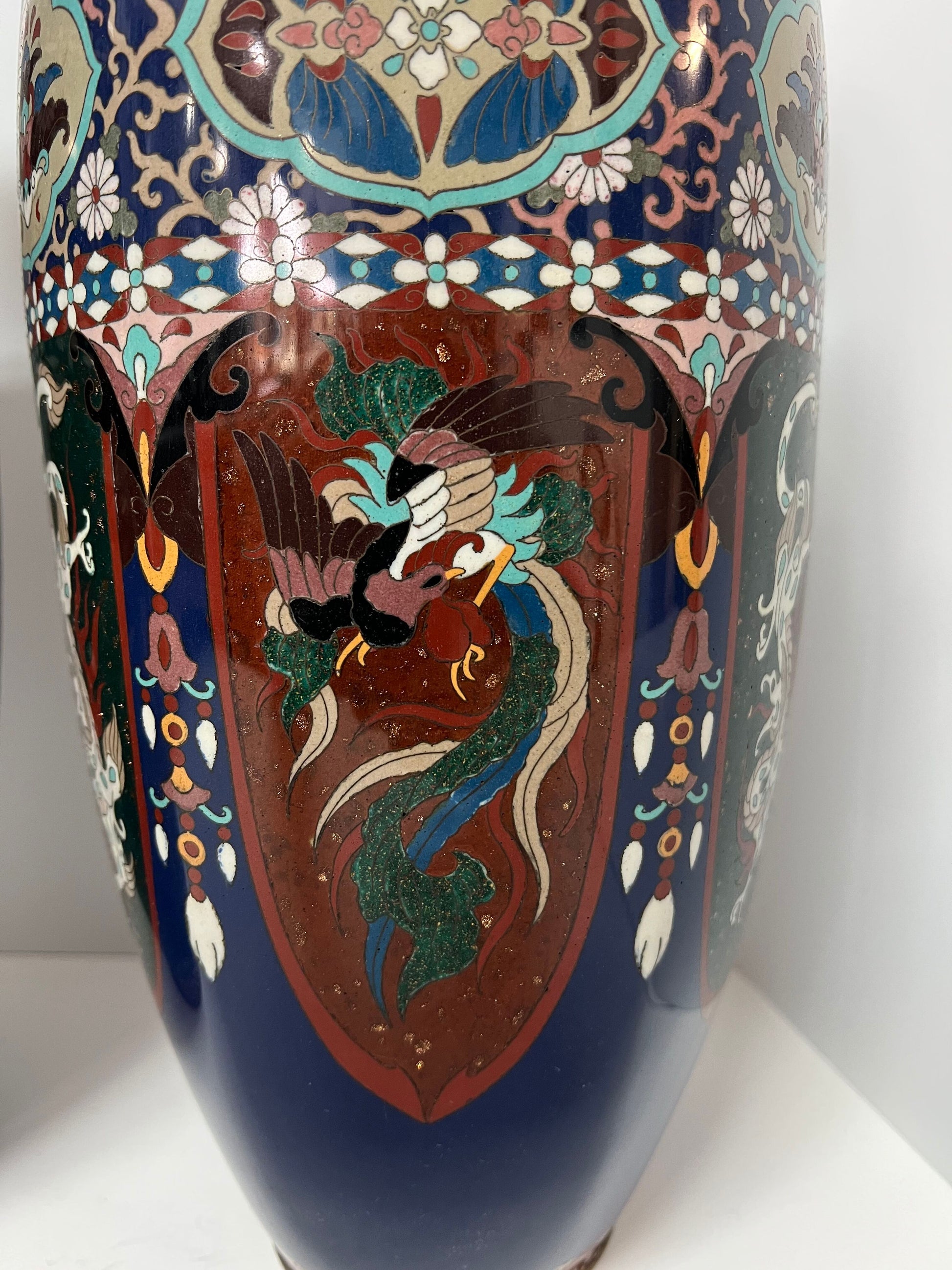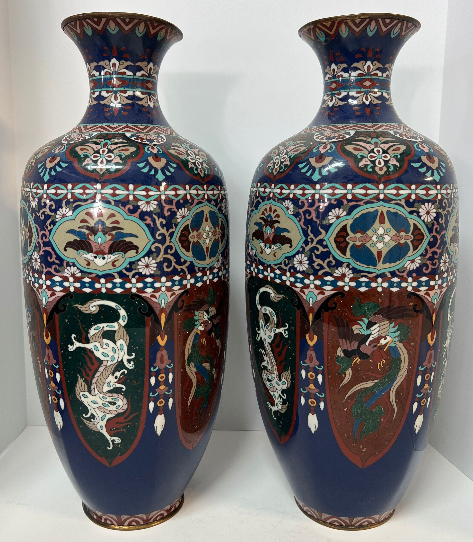 Pair Japanese Meiji Cloisonne Copper Vases Dragon Phoenix 18.25x7.5