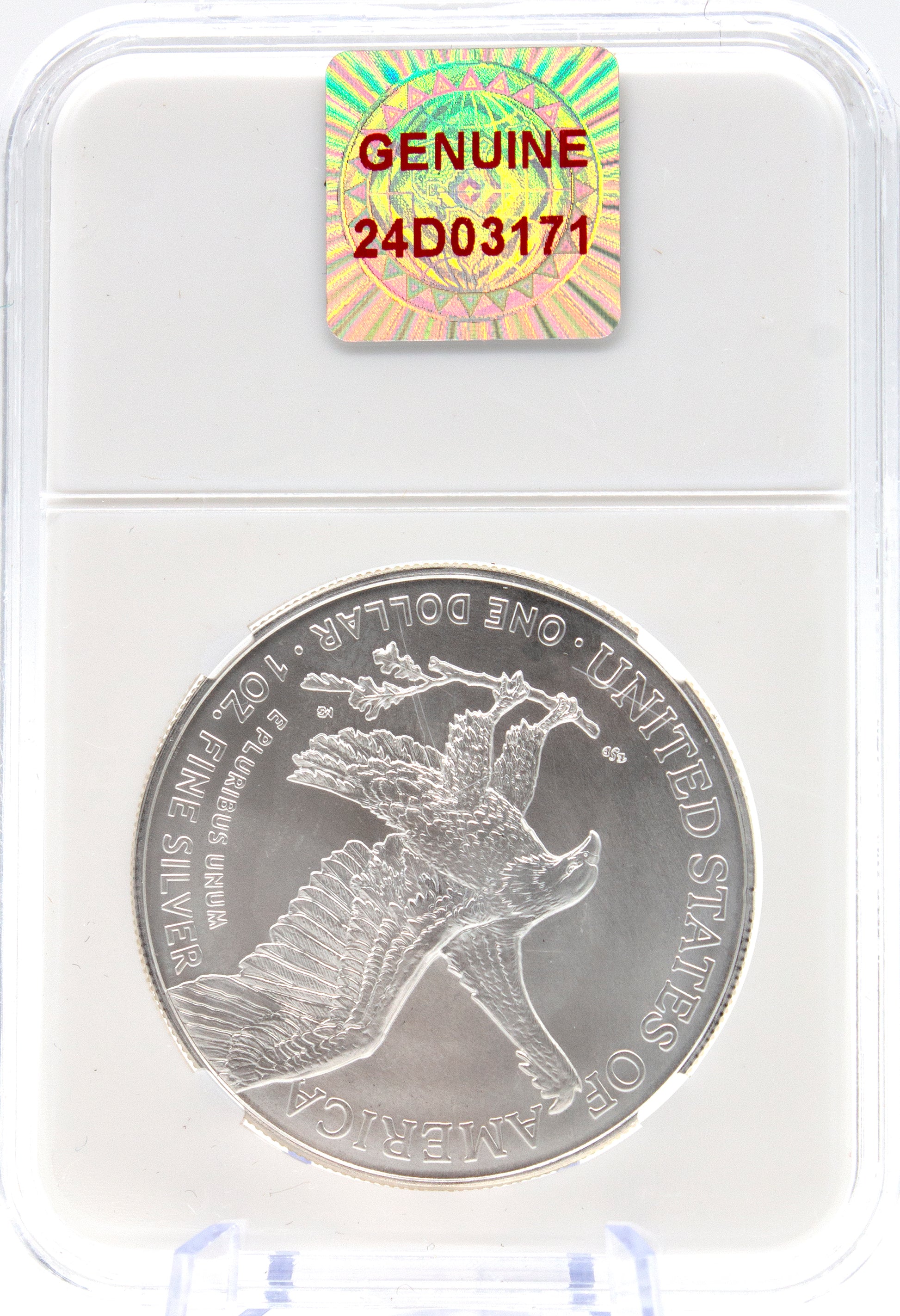 This is a Gem Brilliant Uncirculated 2024 $1 American Silver Eagle. For the obverse of A.A. Weinman chose a full-length figure of Liberty striding toward the dawn of a new day, clad in the Stars and Stripes and carrying branches of laurel and oak symbolizing civil and military glory .The new reverse features a soaring eagle carrying an olive branch of peace with the words United States of America, one dollar, 1oz fine silver.