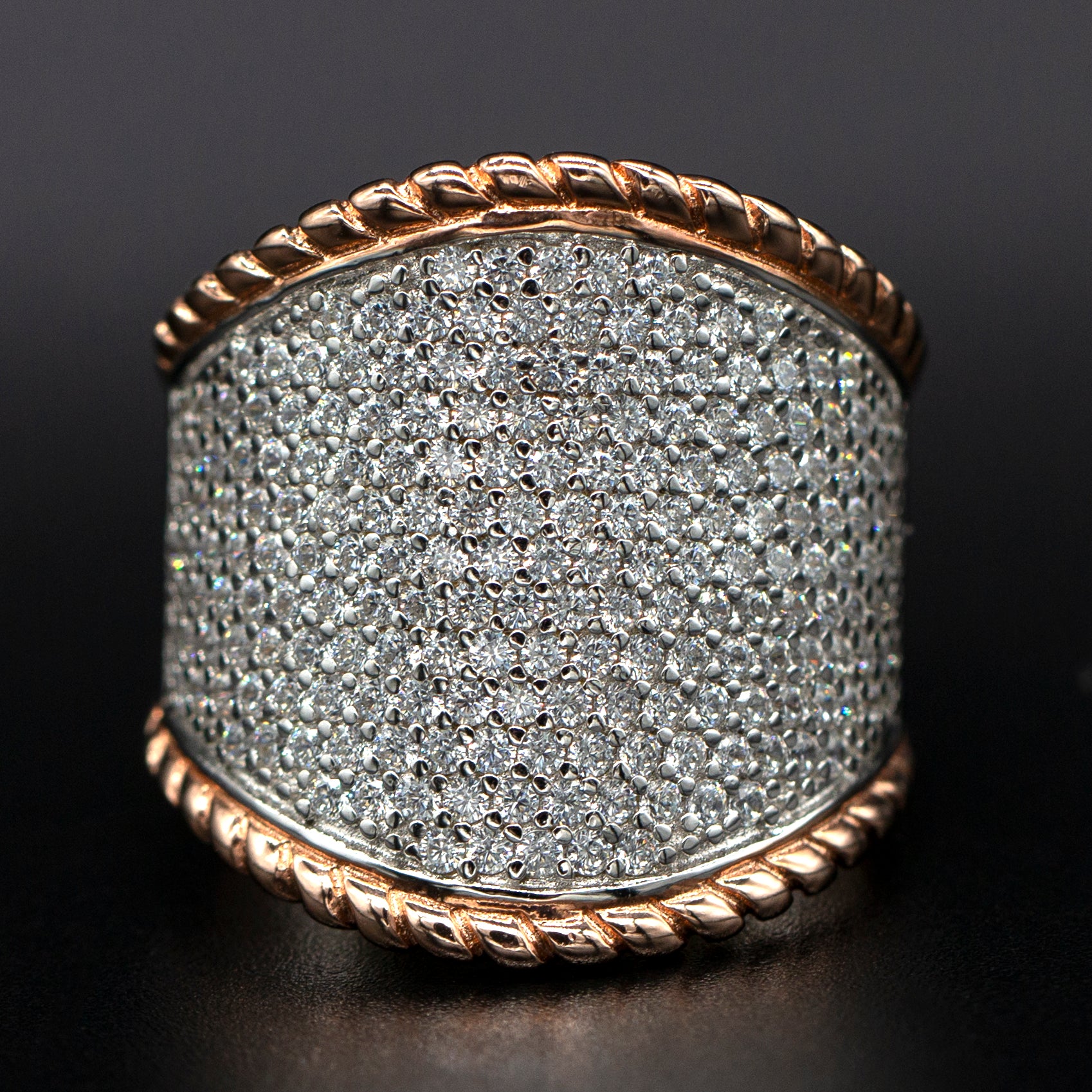 Sterling Silver ring with brilliant sparkling set cubic zirconia gemstones and braided copper detailing. Ring is a size 7 and weighs approx. 10grams.