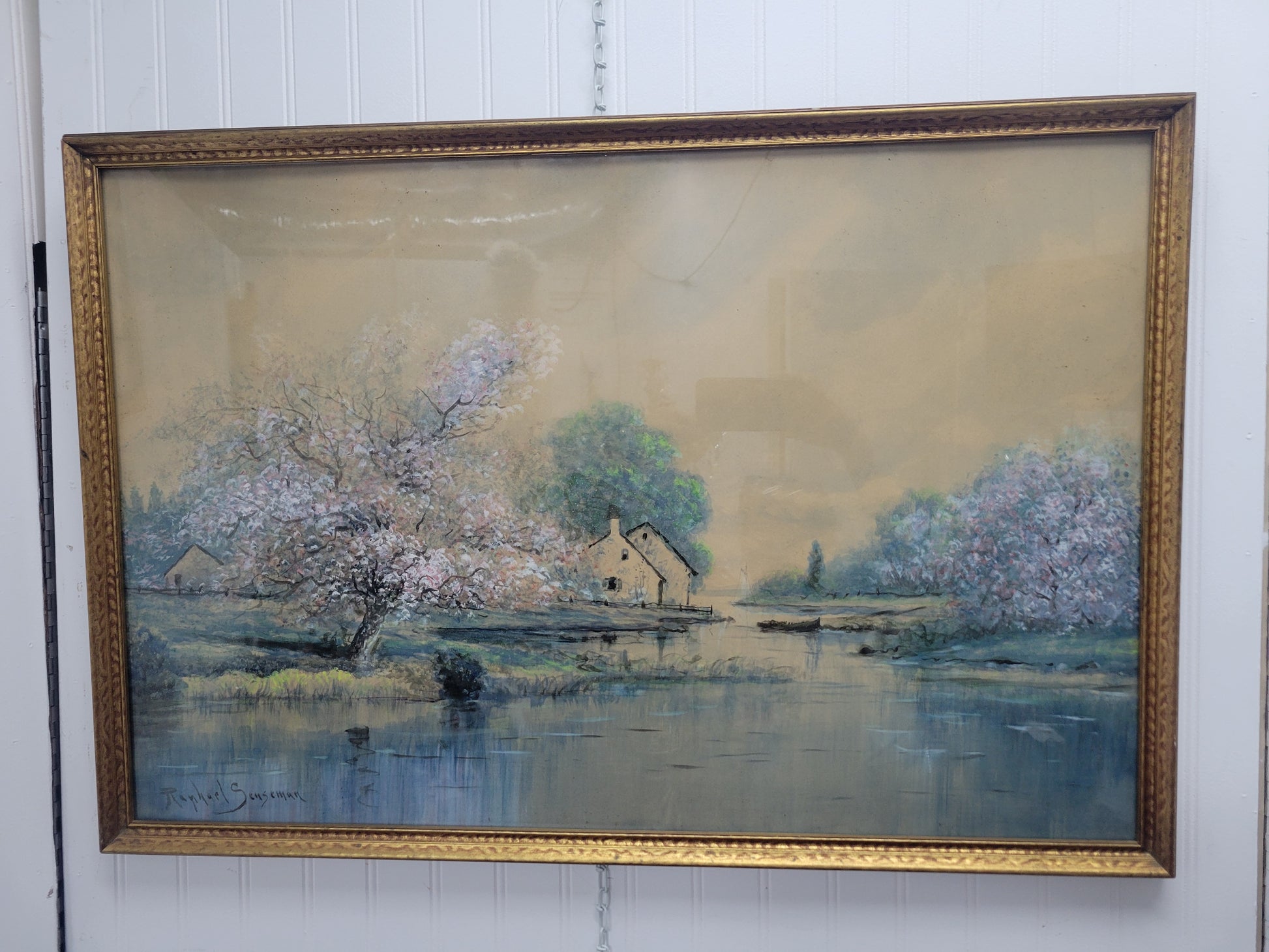Raphael Senseman Riverside Apple Blossom Landscape Watercolor